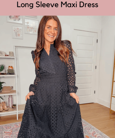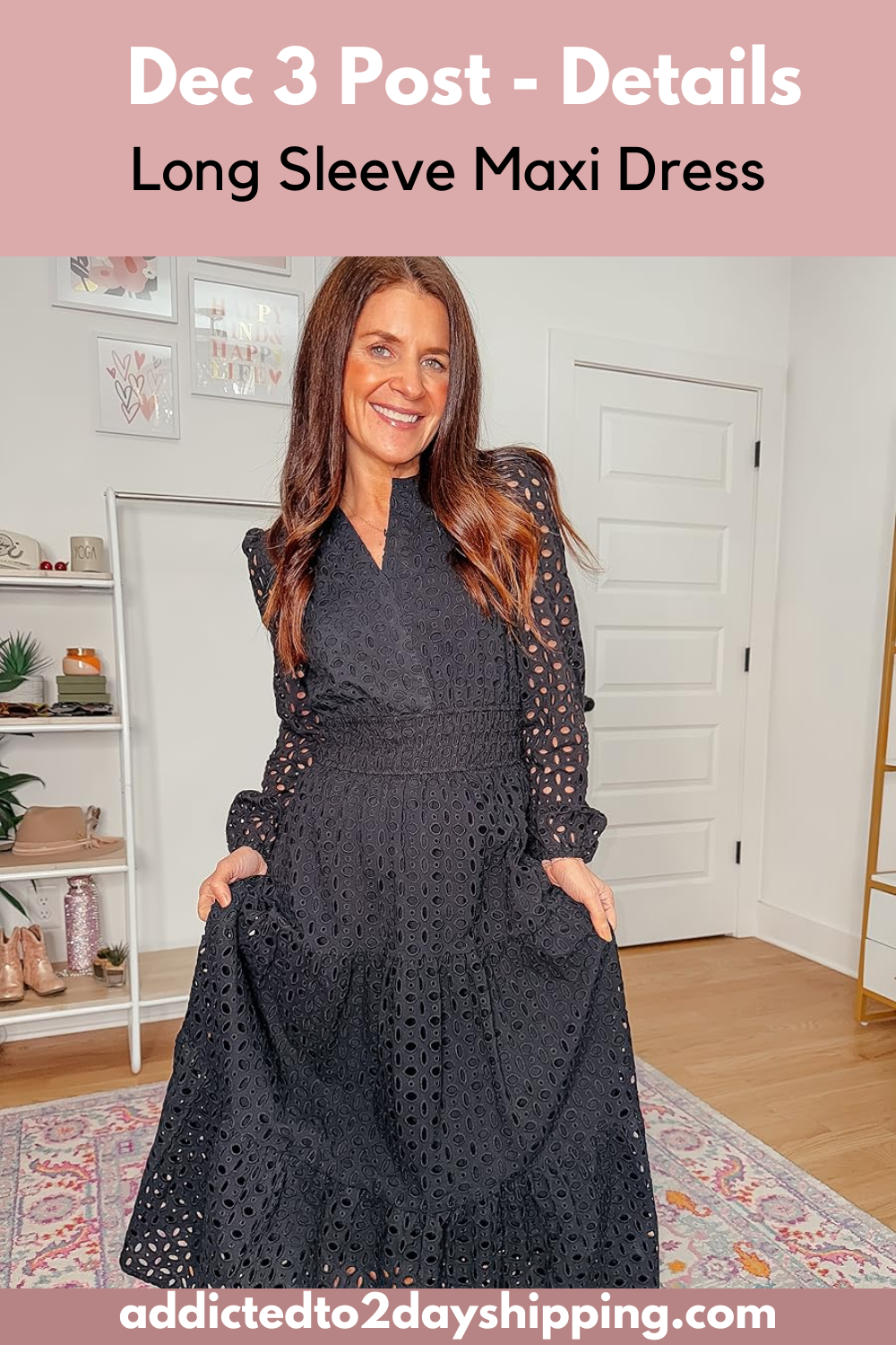 Long Sleeve Eyelet Maxi Dress – 50% off, under $25. Use code HH76Z9HS. Promo expires 12/4 at midnight PST. I am wearing a size XS and find it fits true to size. Click below to shop.