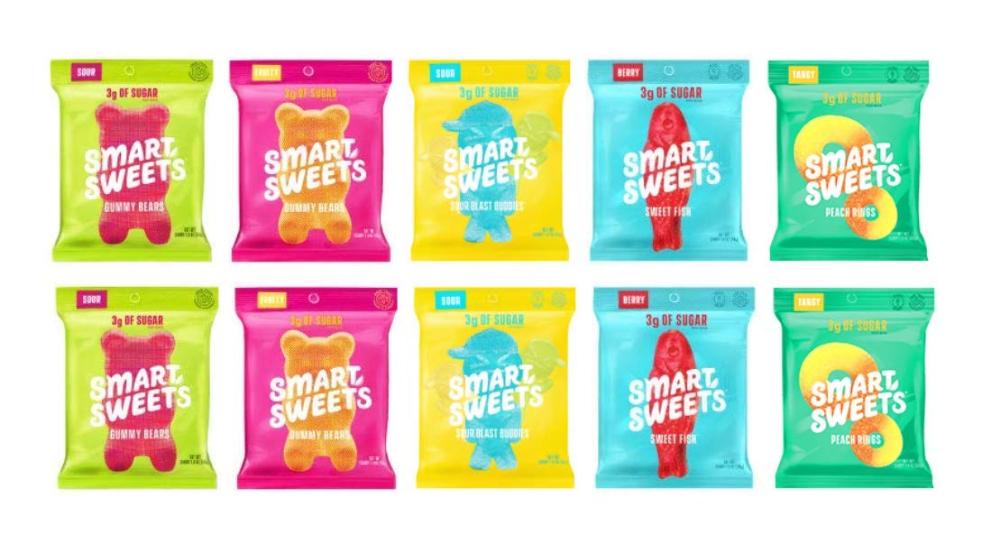 Smart Sweets – No, they don’t make you smart (I wish), but they help with sugar cravings , only have 3g of sugar, and around 80 calories (depending on the flavor). My favorites are the peach rings and gummy fish. All options except the bears are vegan too (if you care about that sort of stuff).