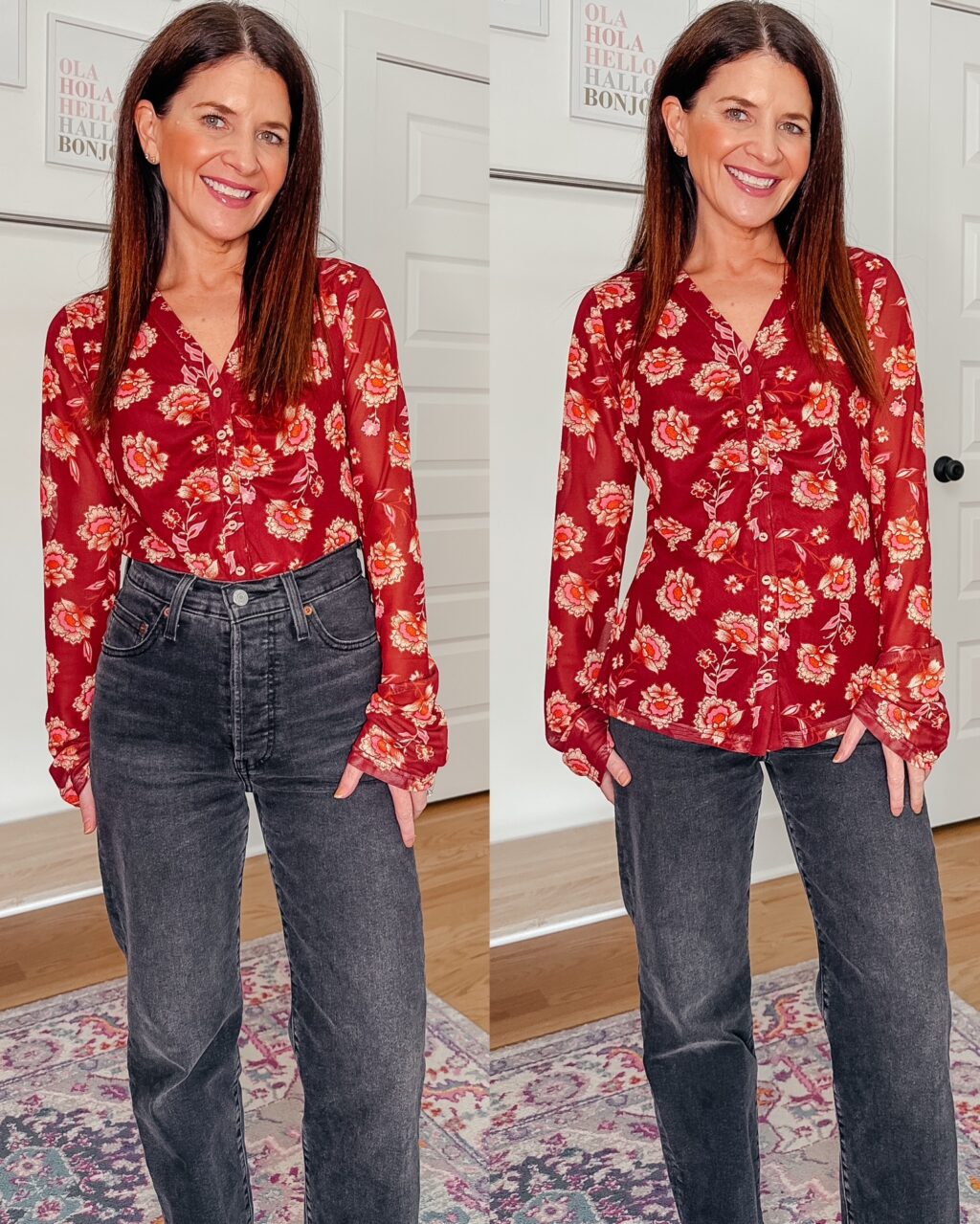 Button up Floral Top – 20% off, under $16. Click the promo on the listing to redeem (promo and coupon do not stack, so make sure to click the 20% promo under the coupon). I am wearing a size small and find it fits true to size. Click below to shop.