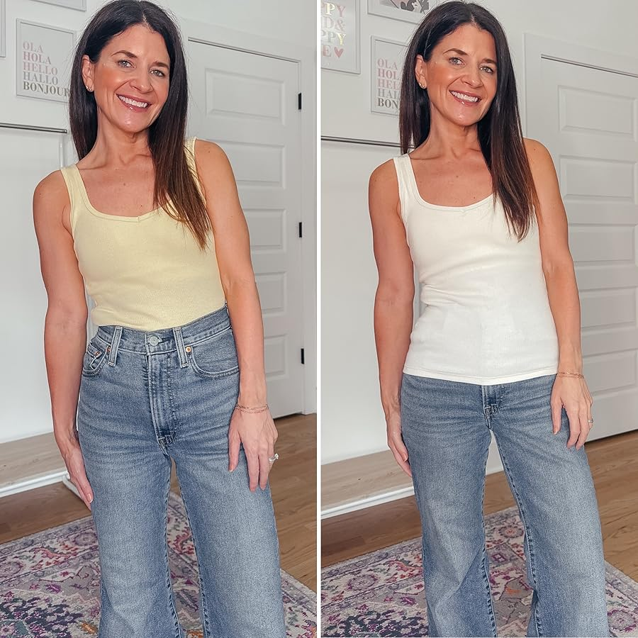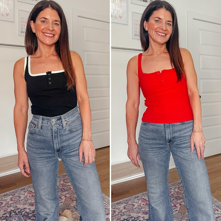 Button Square Neck Tank (black/white & red) – 50% off, under $10. Use code ERFG73G5. Promo ends 9/7 at midnight PDT. I am wearing a size XS and find they fit true to size. Click below to shop.