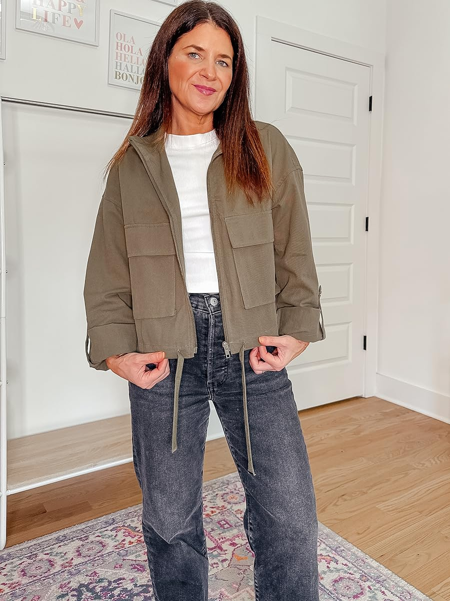 Cropped Lightweight Jacket – 50% off, under $20. Use code XN68FY8Y. Promo expires 9/2 at midnight PDT. I am wearing a size small and would go true to size. Click below to shop.