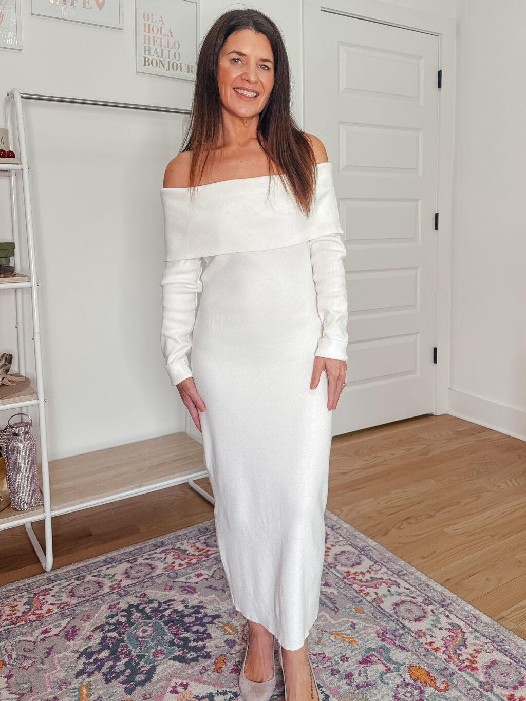 Off Shoulder White Dress – 35% off, under $39. No code needed. Discount taken at checkout. I am wearing a size XS and find it fits true to size.