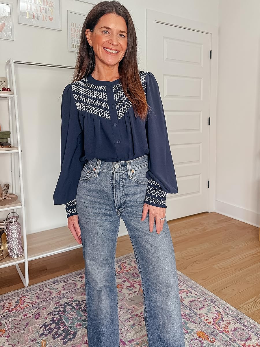 Navy Button Up Top – 50% off (40% promo +10% coupon), under $14. Use code 62S6AKEW. Promo expires 9/8 at midnight PDT. I am wearing a size small and find it runs a little big. Click below to shop