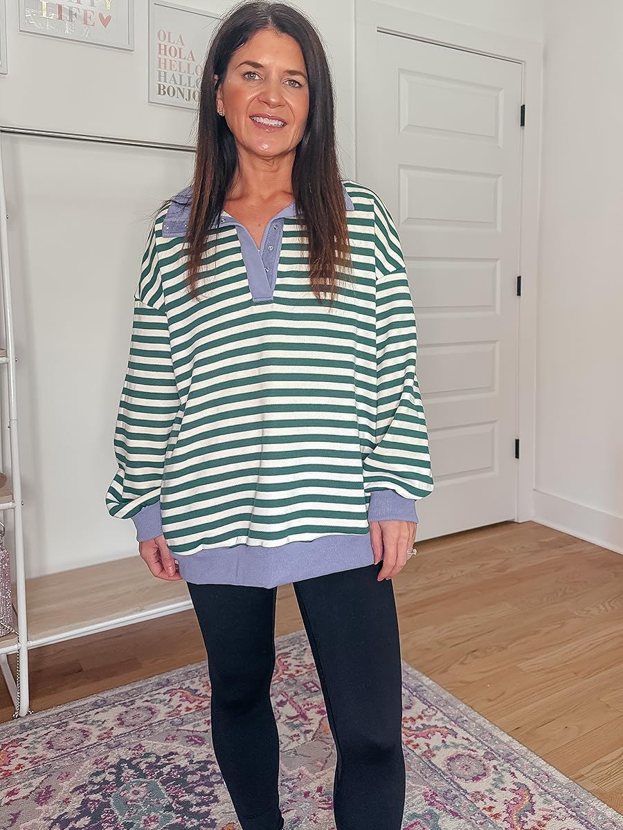 Striped Pullover w/ Collar – 50% off, under $13. Use code KC33R7PE. Promo expires 9/14 at midnight PDT. I am wearing a size small and its a larger fit. I would go true to size. Size up for my fit. This one has pockets! Click below to shop.