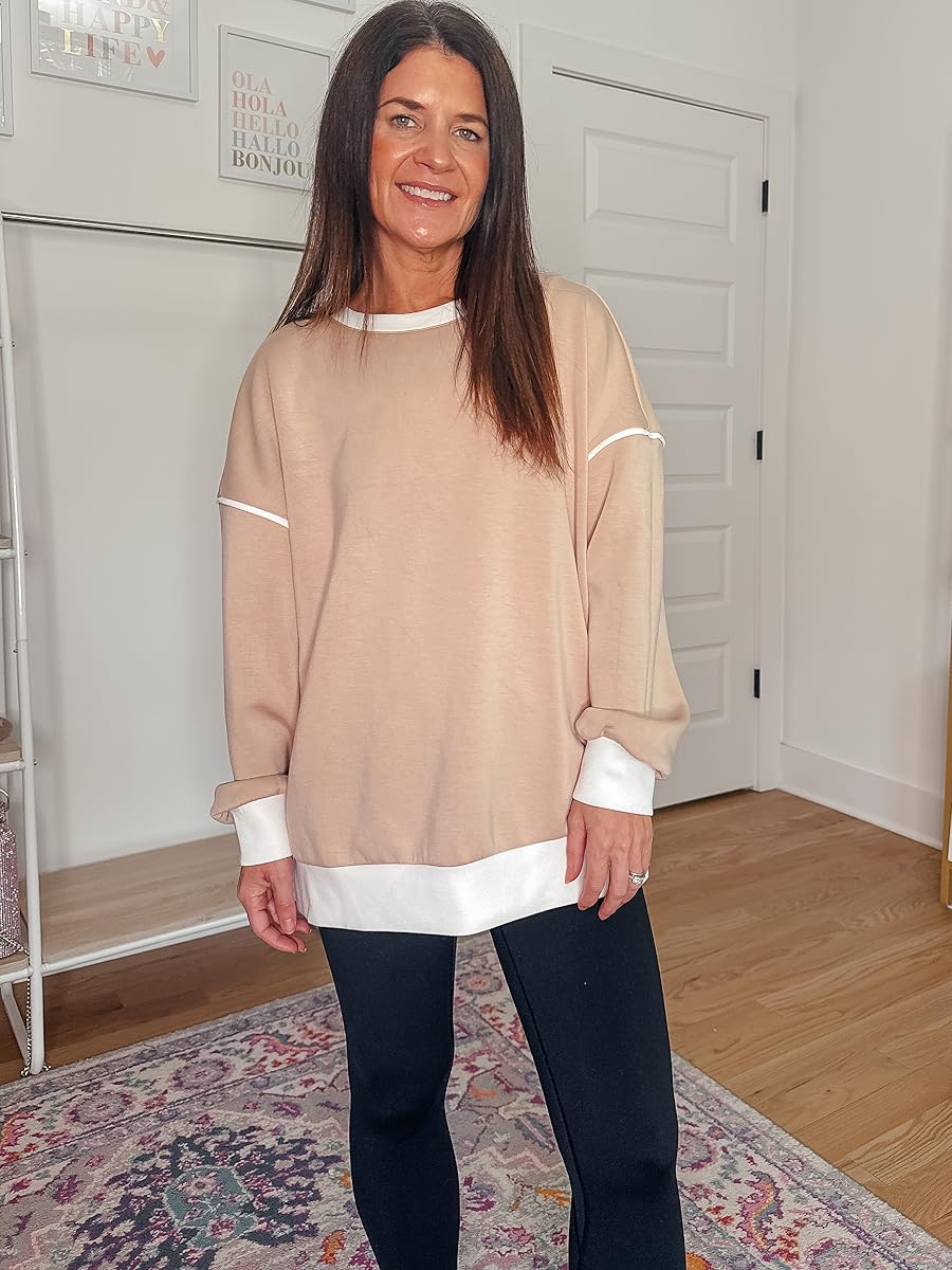 Beige With White Trim – 45% off, under $11. Use code QTZSVUET. Promo expires 9/14 at midnight PDT. I am wearing a size small and its a larger fit. I would go true to size. Size up for my fit. Click below to shop.