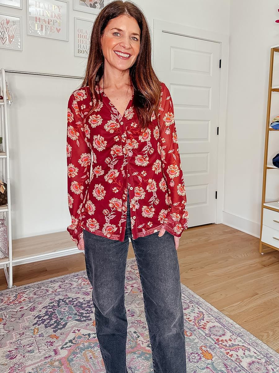 Burgundy Floral Top – 36% off, under $13. Price is marked down on the listing, no code needed. I am wearing a size XS and find it fits true to size. Click below to shop.
