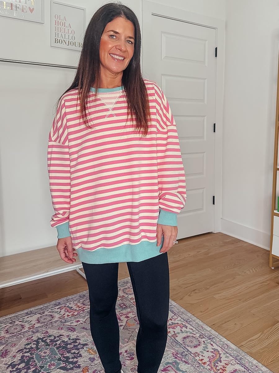 Striped Crew Neck Pullover – 40% off, under $12. Use code CSKE287N. Promo expires 10/15 at midnight PDT. I am wearing a size small and its a larger fit. I would go true to size. Size up for my fit. This one has pockets! Click below to shop.