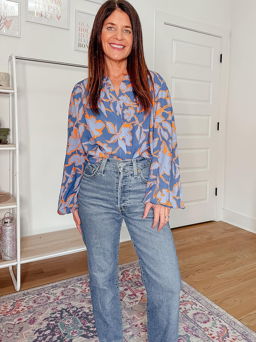Printed Blouse – 50% off (40% off promo + 10% coupon), under $13. Use code 7YH47CUC. Promo ends 10/19 at midnight PDT. I am wearing a small and it is a loose larger fit. You can probably size down if in-between. Comes in 6 color options. Click below to shop.