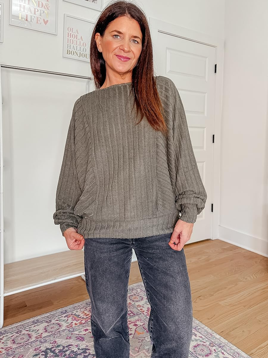 Green Ribbed Top – 35% off, Under $13. Use code 63J2ULEQ. Promo expires 10/19 at midnight PDT. I am wearing an XS and it is a loose, comfy fit. I would go true to size. Click below to shop.