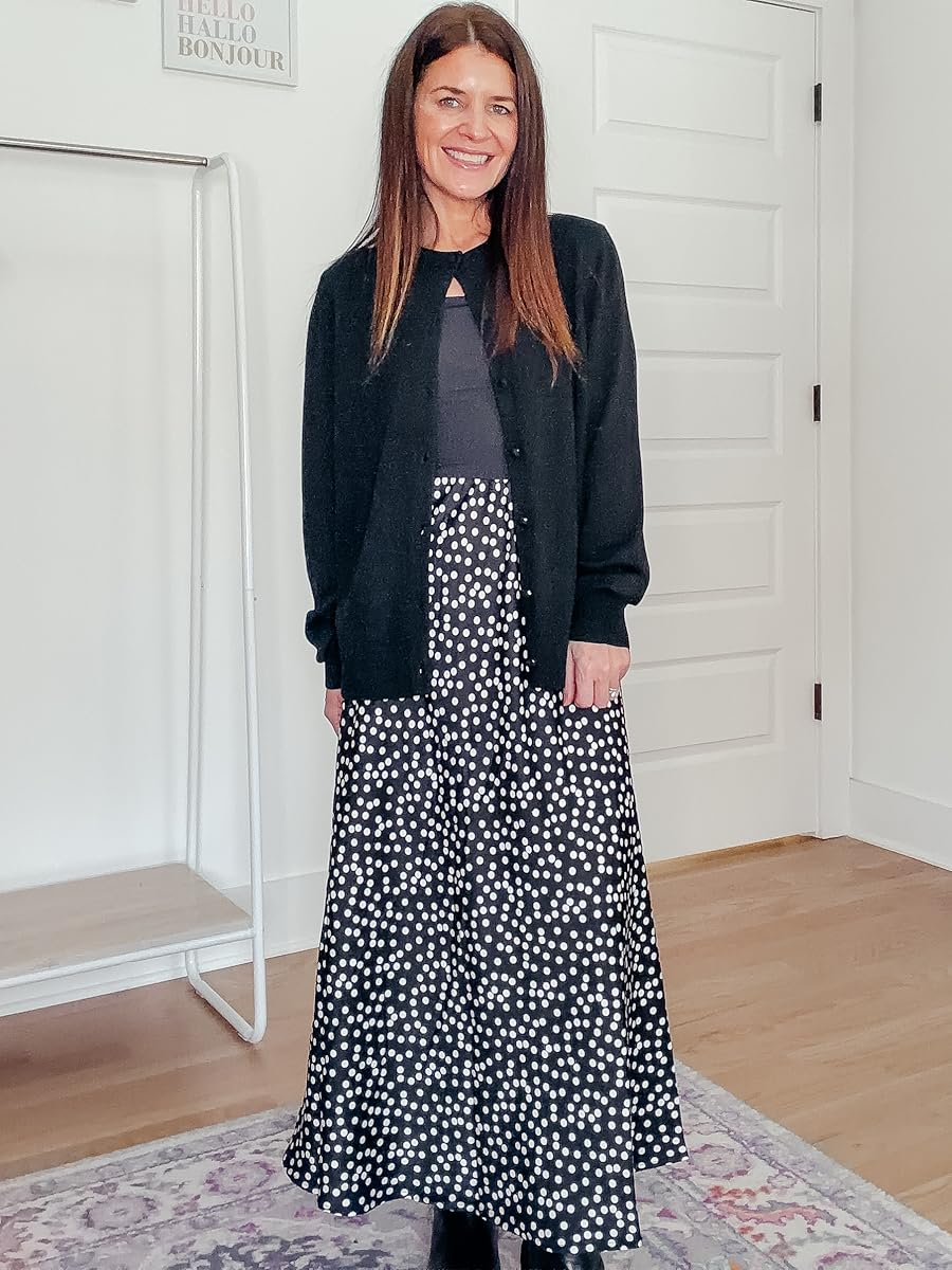 Polka Dot Skirt – 40% off, under $20. Use code PNUVNR7I. Promo expires 11/10 at midnight. I am wearing a size small and find it fits true to size. Click below to shop.