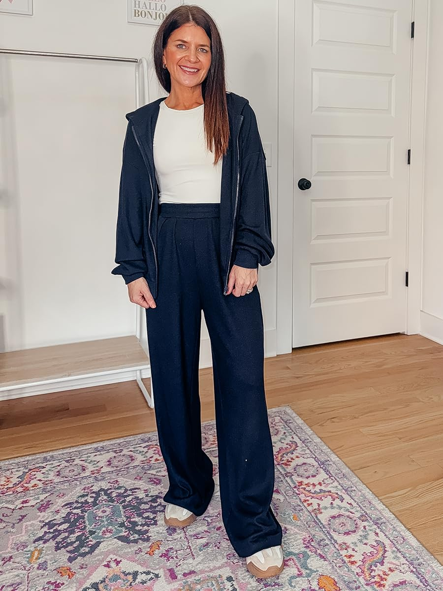 Navy Zip Hoodie Ribbed Set – 50% off, under $23. Use code D5XJHFXY. Promo expires 11/17 at midnight PST. I am wearing an XS and it runs a little big. Click below to shop.