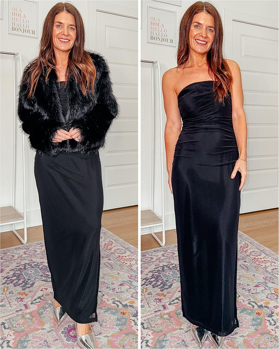 Black Strapless Mesh Dress – 35% off, $20-$28. Use code R5CJHMHI. Promo expires 12/8 at midnight PST. I am wearing a size small and find it fits true to size. Comes in prints and solids. I own in 3 colors! Click below to shop.