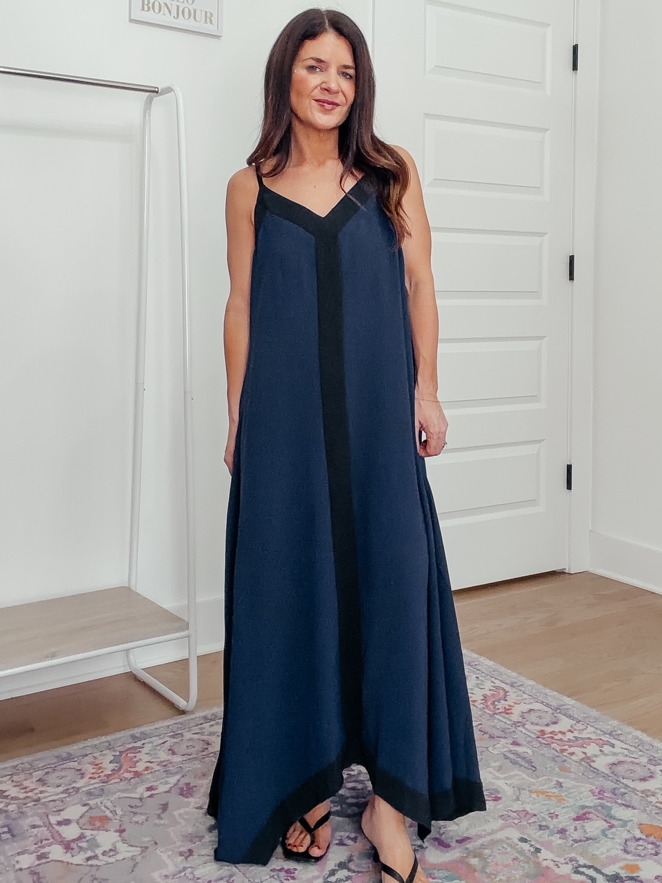 Navy Dress with Black Middle Stripe – 50% off, under $21. Use code TTWTBRBB. Expires 12/28 at midnight PST. I am wearing a size small and it is a loose fit. You can size down if in-between sizes. Click below to shop.