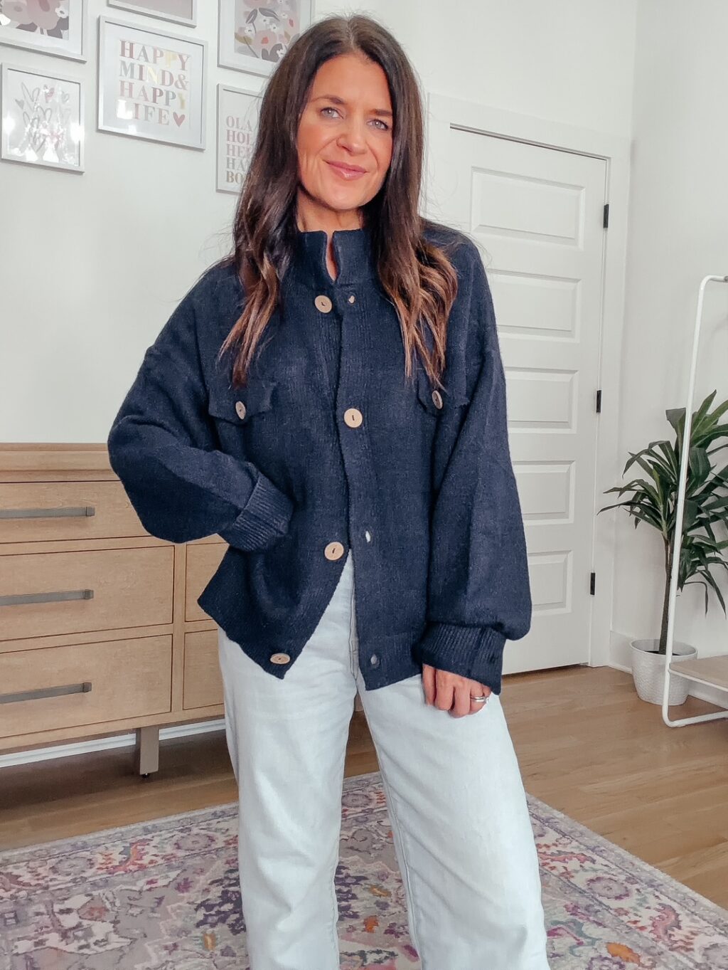Navy Cardigan – 50% off, under $13. Use code 7V4ZCGHZ. Promo expires 2/14 at midnight PST. I am wearing a size small and find it true to size. Click below to shop.