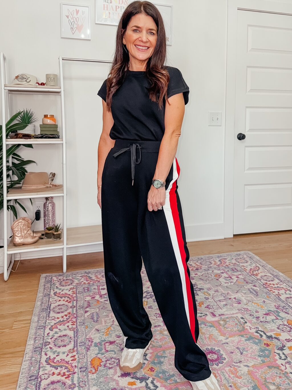 Stripe Pant / Short Sleeve Set – 35% off, $16-$19. Use code K5Z7GDPA. Promo expires 2/20 at midnight PST. I am wearing an XS and find it true to size. Click below to shop.