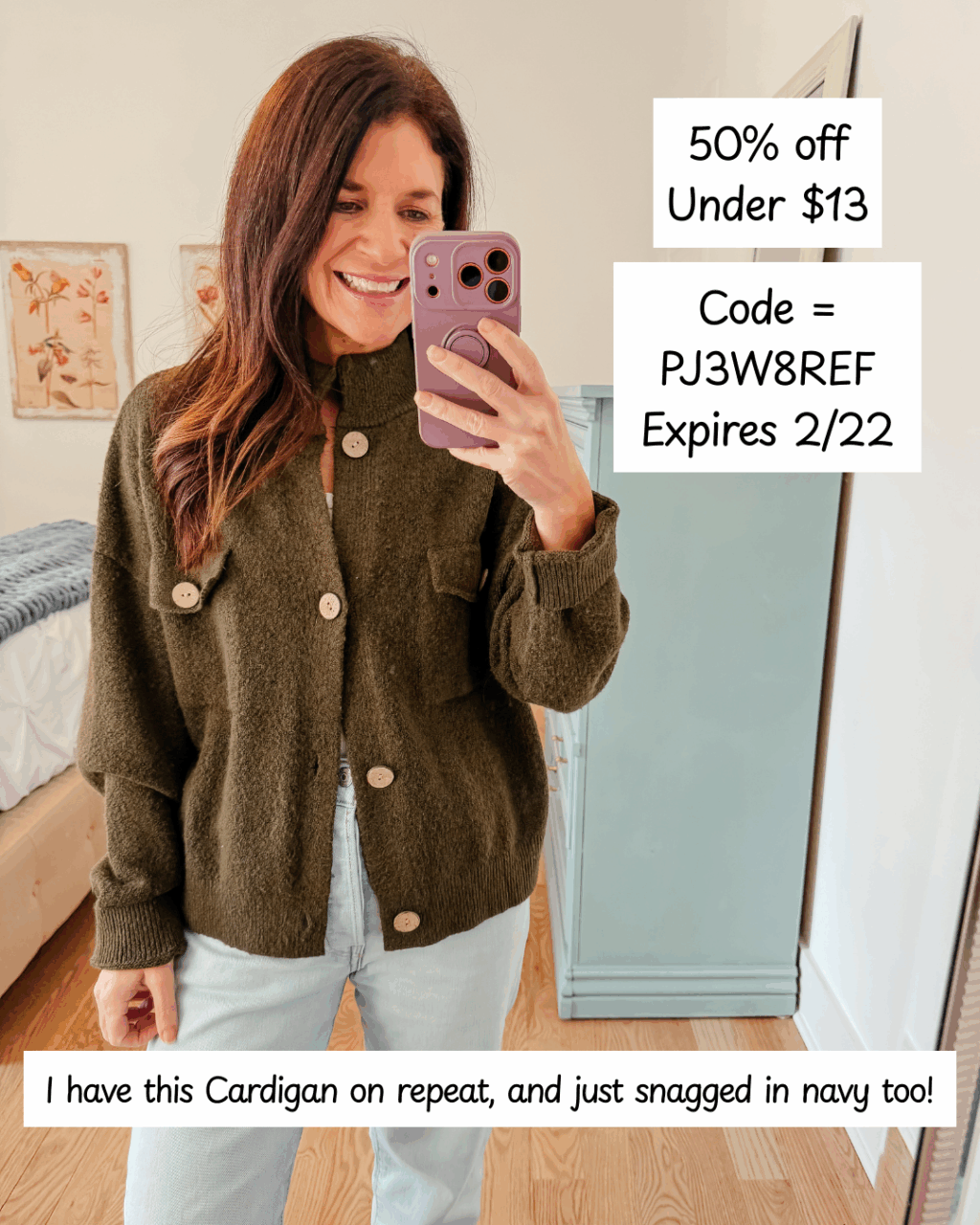 - Green Button Up Cardi – code = PJ3W8REF. Exp 2/22