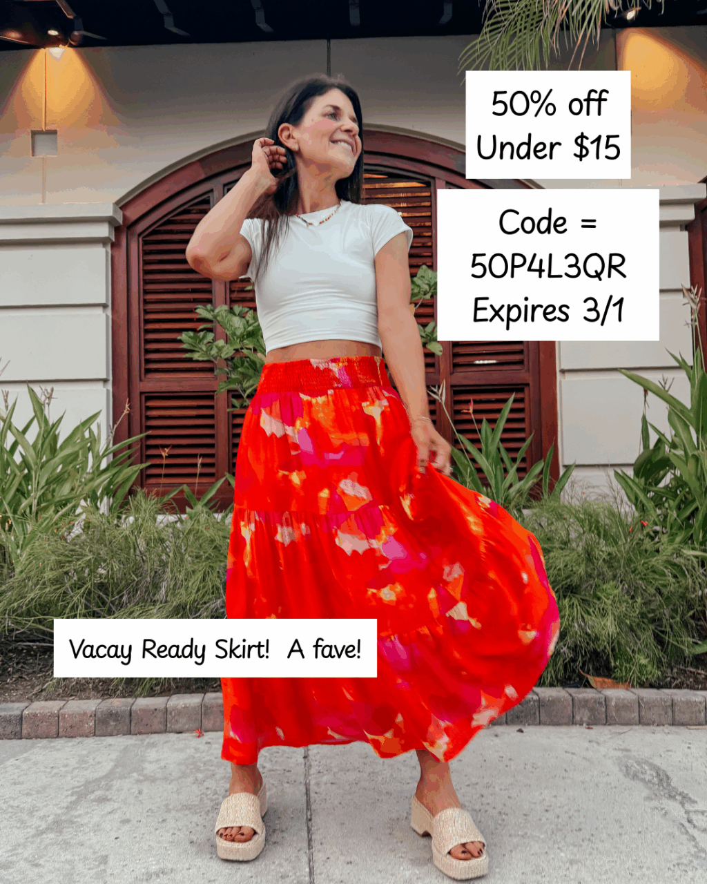 - Orange Printed Midi Skirt – code = 50P4L3QR. Exp 3/1