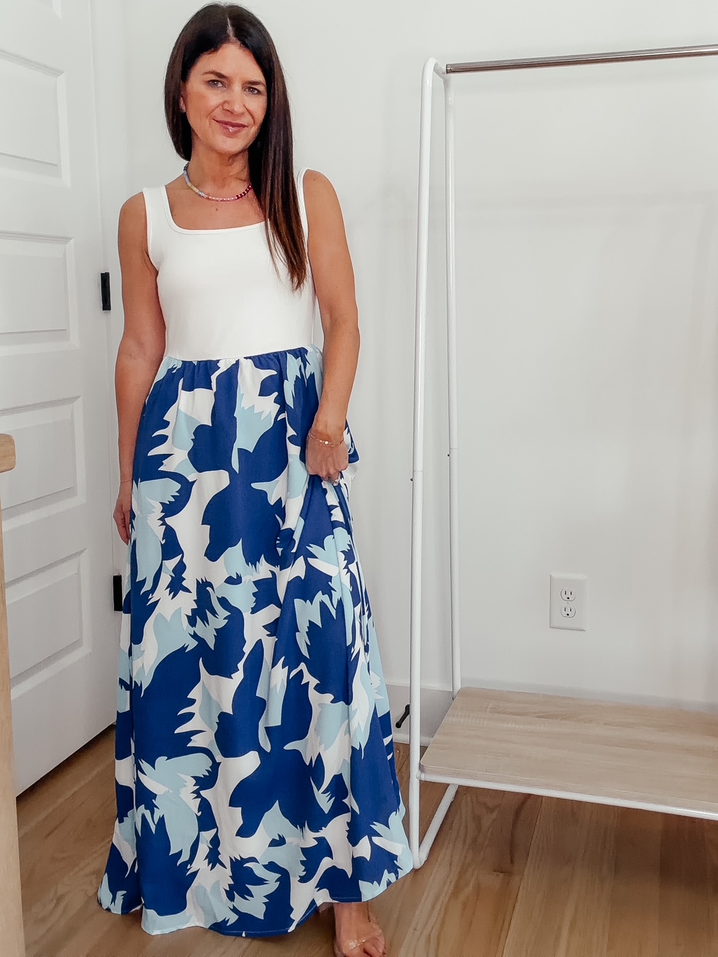 White Top/Blue Printed Skirt Dress – 45% off, under $26. Use code MCFHPZLT. Promo expires 3/7 at midnight PST. I am wearing a size small and find it true to size. Click below to shop.