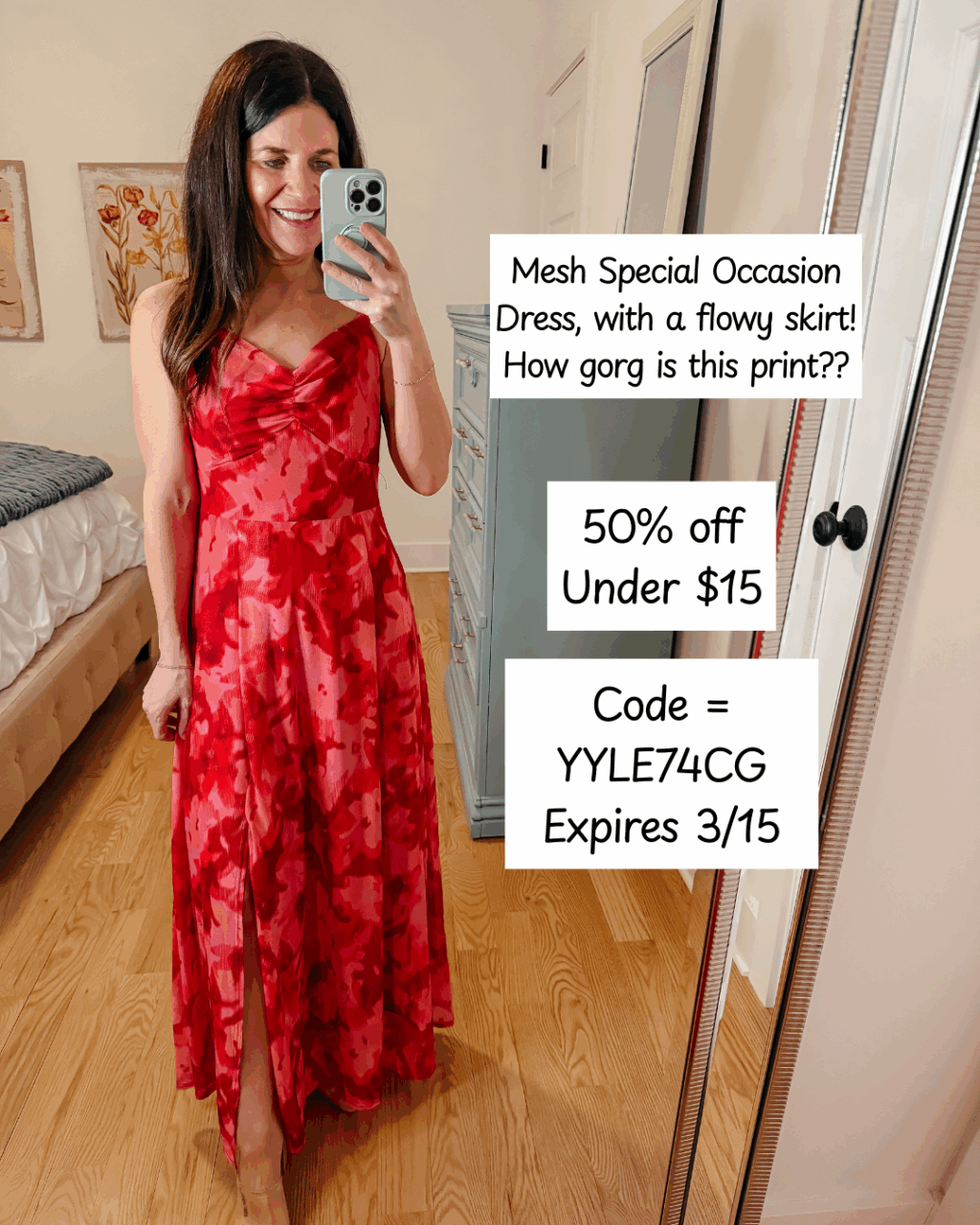 - Red Printed Special Occasion Dress – code = YYLE74CG. Exp 3/15