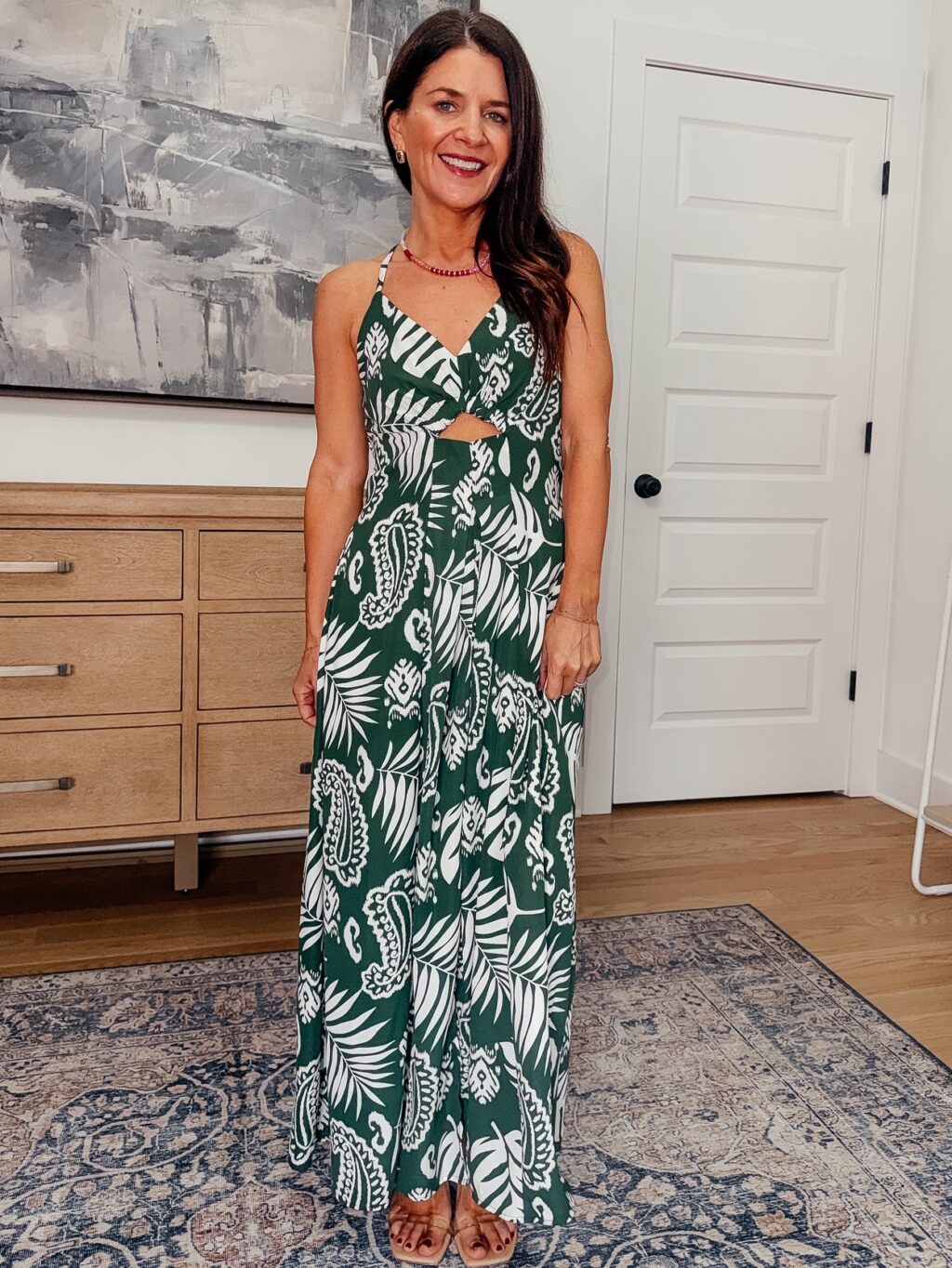 Green Printed Cutout Dress – 40% off, $22-$26. Use code 40Z5HHJL. Promo expires 4/6 at midnight PST. Wearing a size small and find it fits true to size.