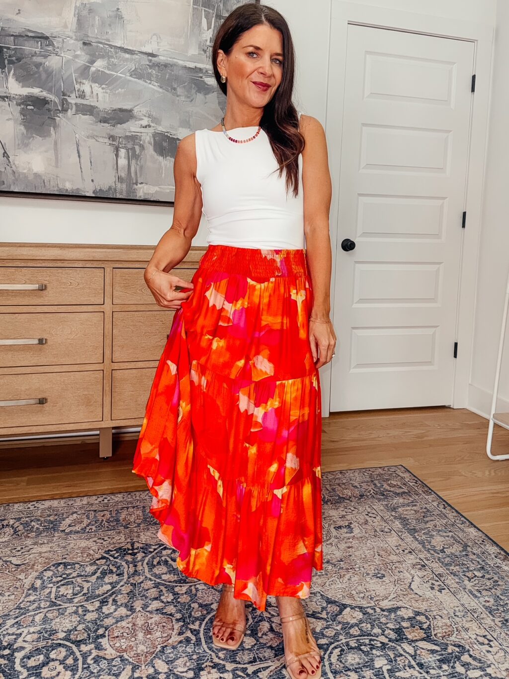 Orange Printed Skirt – 40% off, under $18. Use code 40WLOJJ6. Promo expires 4/5 at midnight PST. Wearing a size small and find it fits true to size