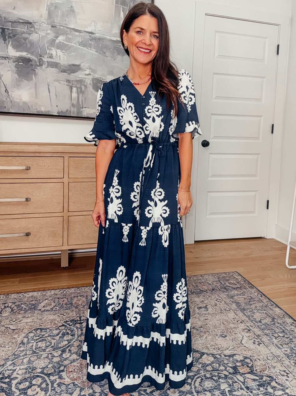 Navy Printed Dress w/ Sleeves – 50% off, under $20. Use code 50ABPRBZ. Promo expires 4/2 at midnight PST. Wearing a size small and find it fits true to size