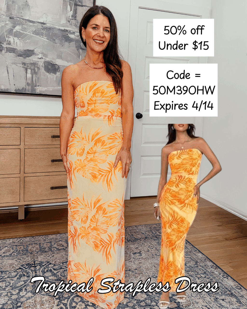 - Tropical Strapless Dress – 50M39OHW. Exp 4/14