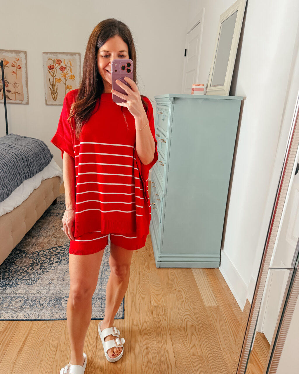 Red Striped Short Set – 20% off, under $32. Use code TB9FVH3W. Promo expires 4/20 at midnight PDT. I am wearing a size small, and find it true to size (loose fit).