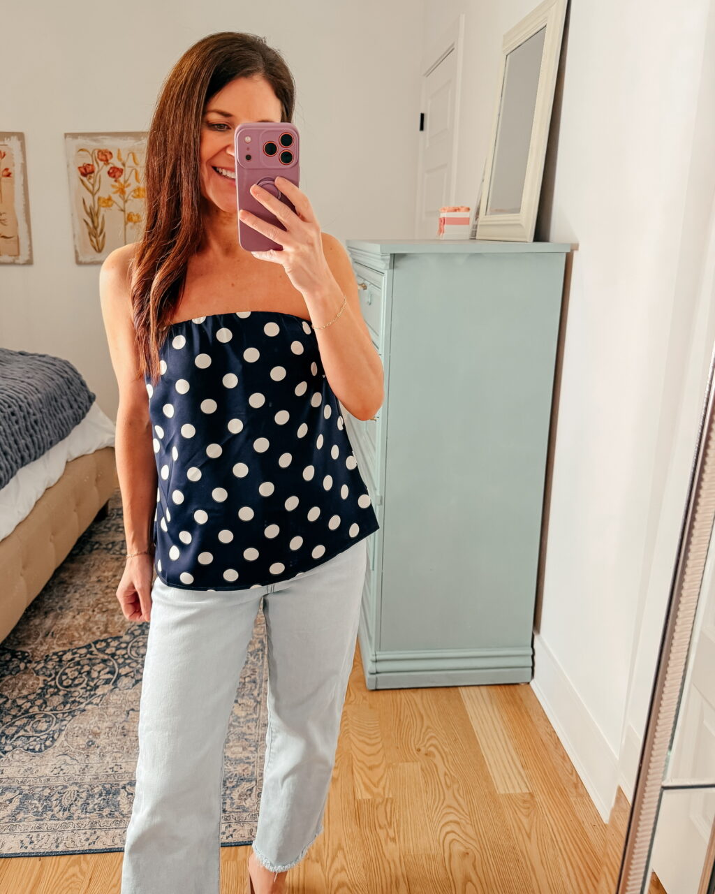 Polka Dot Strapless Top – 55% off, under $8. Use code KC9URO57. Promo expires 4/20. at midnight PDT. I am wearing a size small and find it fits true to size.